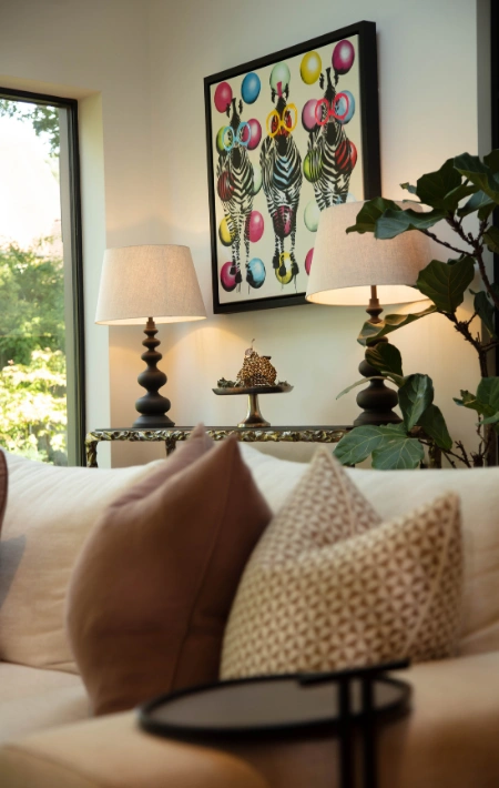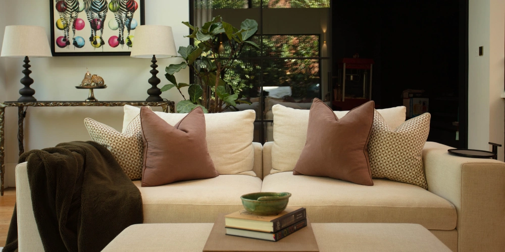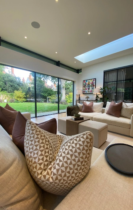Our client came to us wanting to refresh an already designed space and make everything feel more connected. The family room also includes a home theatre with large Crittall-style doors, so one of our biggest challenges was finding a way to reduce noise while still keeping the room looking great.