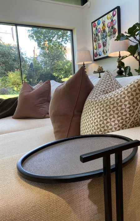 We created two-toned curtains on a smooth track system, perfect for cancelling noise and matching both sides of the room. To pull everything together, we added stylish tables and rugs that made the whole space feel warm, cohesive, and effortlessly inviting.